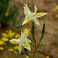 Moraea filicaulis Baker, syn. Moraea fugax ssp. filicaulis (Baker) Goldblatt, is found from Namaqualand south to Clanwilliam. It grows in rocky ground or deep sand and flowers August to October. It has 2 filiform leaves and white flowers, rarely blue violet, with yellow nectar guides. The plant and flowers are smaller than the other subspecies. Photographed September 2006 in Namaqualand by Bob Rutemoeller and Mary Sue Ittner.