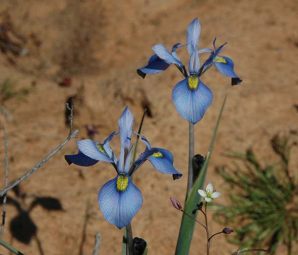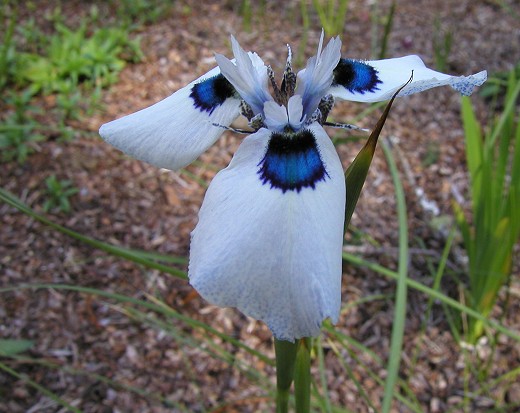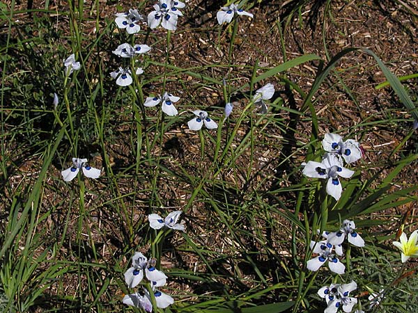 Moraea aristata (D.Delaroche) Asch. & Graebn. is an endangered species in South Africa where it survives only in a small protected area near Cape Town. It is white with dark blue nectar guides sometimes outlined in another color. It had been an easy plant to grow in Northern California where it multiplied rapidly. Photo 1 was taken by Bob Rutemoeller and photos 2-3 were taken by Mary Sue Ittner. The second shows a number in bloom in March 2005 where there were almost 100 blooms. Photo 3 photo shows the speckled back of the flower. Since that time the population has dwindled. Photos 4-6 were taken by Nhu Nguyen of the same clone as in the first three photos. Photo 6 shows a 'blue trio' of M. aristata, Gladiolus gracilis and Tecophilaea cyanocrocus.