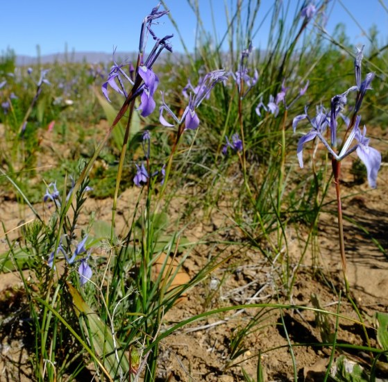 Moraea algoensis Goldblatt is found in the Cape on clay slopes in renosterveld where it blooms in late winter, early spring. Rarely less than 30 cm, it has one long leaf and small violet flowers with white to yellow nectar guides that stay open for several days. It resembles Moraea tripetala but is much smaller. The first photo by Mary Sue Ittner of a plant in cultivation and the second from Cameron McMaster of a plant photographed in the Eastern Cape. The last photo from the book Plants of the Klein Karoo courtesy of Jan and Anne Lise Schutte-Vlok.