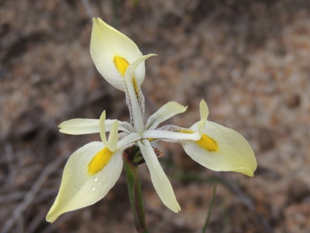 Moraea anomala G.J.Lewis is found in the southwestern and western Cape from the Cederberg Mountains to Caledon and Bredasdorp. It grows on mountains and flats, often on clay soils and flowers best after fires. It has a single terete leaf and pale yellow flowers with distinctly yellow nectar guide and non-sticky nodes. Pollen is orange to red. It flowers only well after a fire the previous season from late September to November. The flowers are short lived, opening only after midday and fading by sunset. The first two photos taken by Cameron McMaster in the Overberg. The last photo from Rod Saunders.