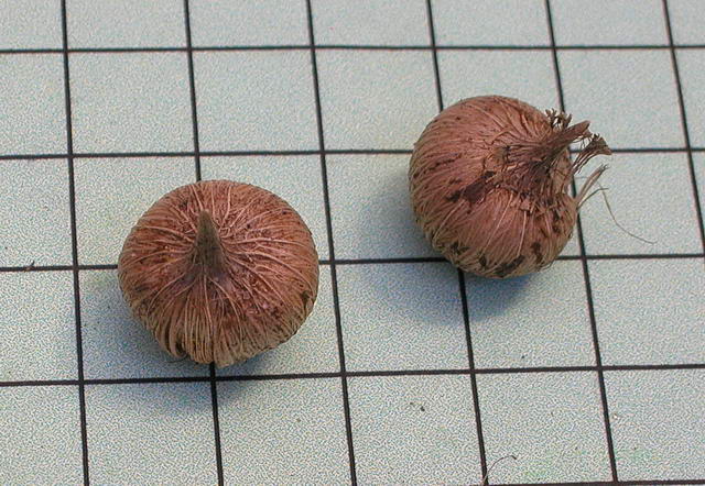 Seeds of this species differ from most other Moraea. These were grown by the late Bob Werra. In the first photo, taken by Bob Rutemoeller, the seed coats are intact. In the second photo below by M Gastil-Buhl with 1 mm green grid lines, some seed coats have rubbed off of the round inner part of the seed. The third photo by Carlo Balistrieri shows the angular seed coat cleaned off to reveal a much rounder seed. The shape is described as angular in the reference [1]. Whether the exposed seeds germinate is to be determined.