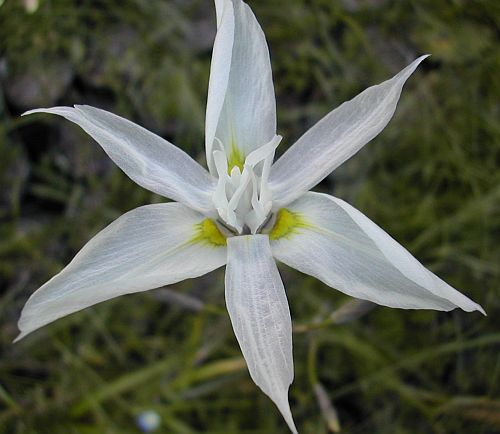 Moraea vespertina Goldblatt & J.C.Manning is a species with fairly large lemon scented white flowers that open around 6 p.m. and close around 8 p.m. A new species published in 2000, Moraea vespertina was found in seasonally waterlogged areas near Nieuwoudtville in heavy red doleritic clay. Plants are 70-100 cm tall. Some PBS members report that this species blooms reluctantly when grown in pots, even large ones. They recommend growing it in the ground for best results. Photos by Dirk Wallace.