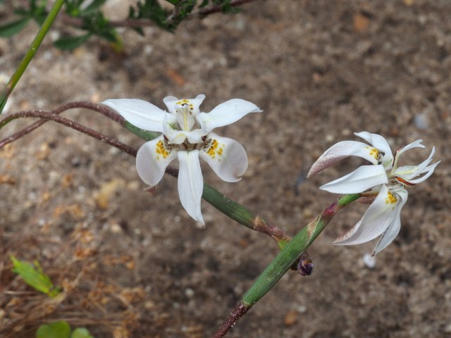 Moraea viscaria (L.f.) Ker Gawl. is found on the coastal areas of the southwestern cape between Saldanha Bay and Cape Agulhas. It grows on sandy or stony flats and slopes. It has white, fragrant small flowers. Height range: 20-45 cm. It blooms spring to summer and has fugacious flowers that open late afternoon and fade by early evening. Photo by Cameron McMaster. The last three photos from iNaturalist taken by Felix Riegel in October in the Overberg and shared under a CC BY-NC license.