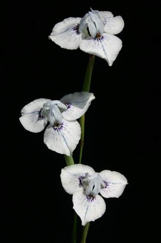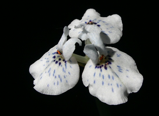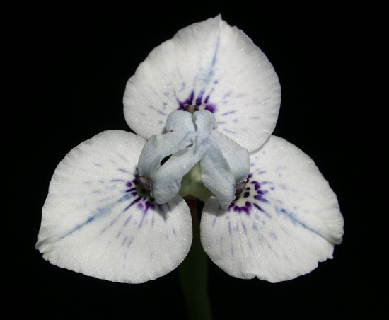 Moraea barnardii L.Bolus has a single leaf and white flowers streaked with blue with cream nectar guides outlined in dark blue. The flowers are about 1 inch in diameter and with their blue or black lines and dots they are most charming. The blossom lasts 3-4 days and repeats periodically for 3 weeks. This species is found on rocky sandstone slopes in the southwest Cape. The first three photos by Bob Werra is of one of his favorites. Alan Horstmann took the last photo.