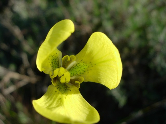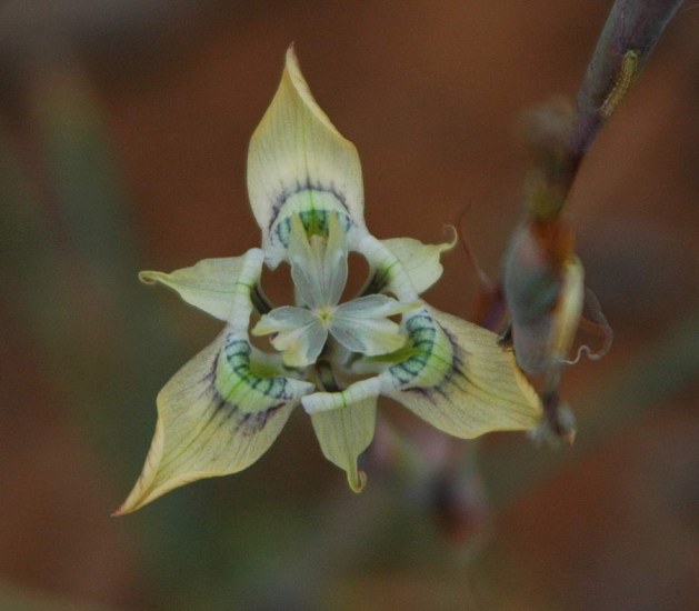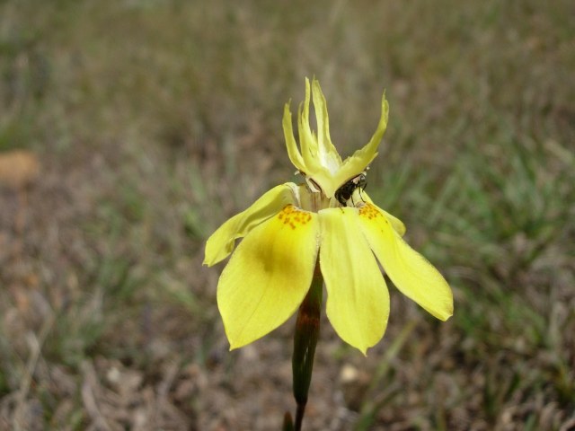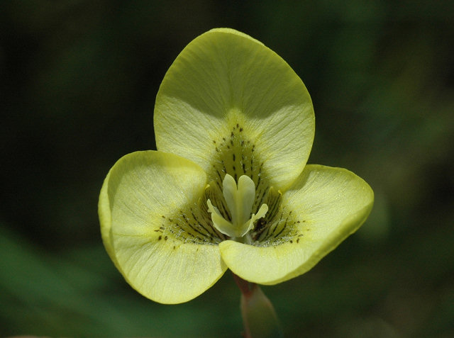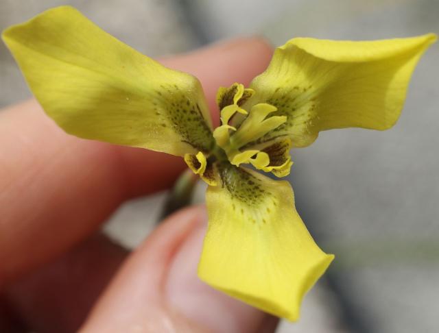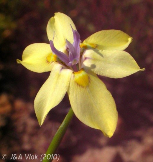 Moraea bolusii Baker grows on rocky flats and hills in thin sandy soils in Namaqualand. This species is from 7 to 20 cm high and has a long solitary trailing leaf with crisped or undulate margins and pale yellow and white flowers with deeper yellow nectar guides on the outer tepals. It flowers September to October with flowers opening early afternoon and fading by sunset. Photos taken by Andrew Harvie northeast of Springbok in Namaqualand.