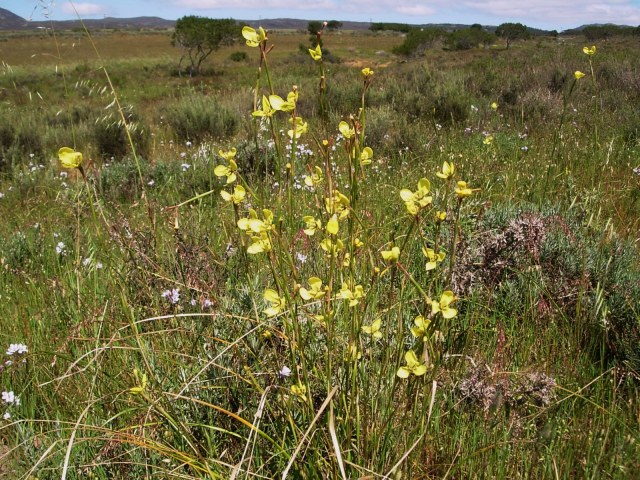Photos below from the book Plants of the Klein Karoo courtesy of Jan and Anne Lise Schutte-Vlok. They describe this species as usually about 20 cm tall, but sometimes up to 40 cm with two to four narrow leaves. Branched flowering stems carry many flowers in spring, flowering abundantly after good rains.
