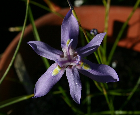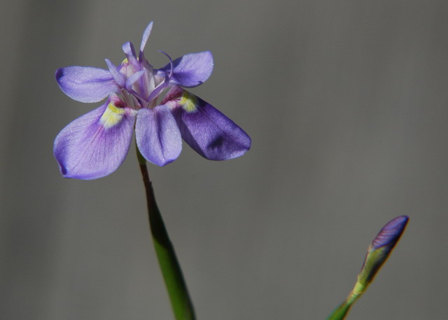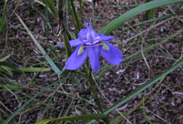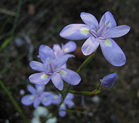 Moraea bipartita L.Bolus is found on clay flats in the Karoo, southern Cape and the Eastern Cape, areas that may have winter rainfall, year round rainfall or even predominantly summer rainfall. Flowers are enclosed in green spathes and are blue with yellow nectar guides. Mary Sue Ittner found that the flowers only open when it is warm and later in the day, closing the same day. Each time she acquired new bulbs they have bloomed the best the first year and then rarely been seen again. They could be from dry areas and not like the excessive winter rainfall she gets. Photo 1 from Bob Rutemoeller. Photos 2 and 3 from Mary Sue Ittner. The first was discovered in 2004 returning in the ground, late one afternoon as the light was fading. Photo 3 was taken in 2009. Photos 4-5 were taken by Bob Werra who writes: "This species is a bit unpredictable but sets a lot of seed without help. Each flower is fugacious but many blossoms are open at a time and it continues to repeat with new blooms for weeks."