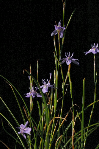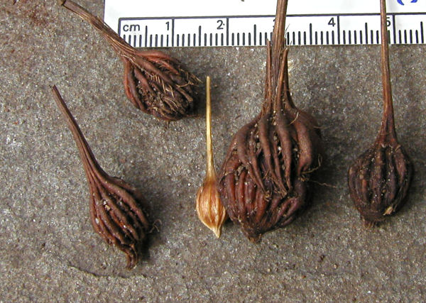 Moraea bituminosa (L.f.) Ker Gawl. has sticky stems as can be seen in the picture as an insect is stuck to the stem. It is found in the higher rainfall areas of the southwestern Cape where is grows usually on stony sandstone soils, but also on mixed sandy clay. It flowers late in the season. It is branched with flowers opening late afternoon. The first two photos by Mary Sue Ittner show flowers growing in cultivation blooming mid June 2005. The third photo shows the corms. The last photo from Rod Saunders.