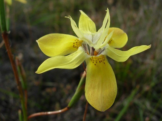 Moraea bellendenii (Sweet) N.E.Br. is a very tall yellow blooming Moraea and one of the last ones to bloom in my garden. In nature it is found on granitic or clay slopes in the southern parts of the Cape. The inner tepals are tricuspidate with short lateral lobes and a slender central cusp curved inwards. The tepals curve upward. It is closely related to Moraea tricuspidata which has white flowers and tepals that spread horizontally. It occasionally skips a year for me and often divides into smaller corms. I have found it grows best in the ground or a very deep container. Photos 1-3 by Bob Rutemoeller and Mary Sue Ittner. Photo 4 was taken by Dirk Wallace. Photos 5-6 by M. Gastil-Buhl show a close-up of a flower from corms received from Michael Mace and the resulting corms from two flowered plants on a 1 cm grid.
