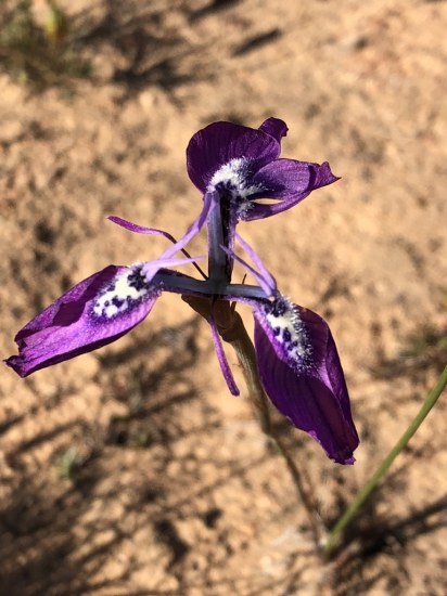 Moraea tripetala ssp. violacea Goldblatt & J.C.Manning - violet flowers with yellow nectar guides. Relatively short plants. Stiff hair-like inner tepals around 2 mm in length, pollen white. Ceres to western Karoo. Blooms August to October. Photo from iNaturalist taken by Marion Maclean in August and September in the Little Karoo and shared under a CC BY-NC license.