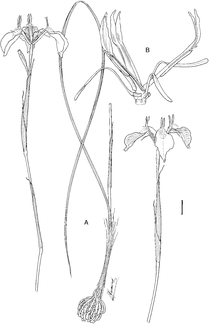 Moraea hainebachiana Goldblatt & J.C.Manning - Pale violet to deep blue flowers. Nectar guides have dark lines and dots on a diffuse white background, with dark lines radiating onto the tepals. Inner tepals expanded in the middle. Blooms August to September. Grows cormlets in the leaf axil and at the base of the parent corm. This species does not set seed, and its pollen appears to be infertile. It apparently reproduces through cormlets. (This was the first plant in South Africa named via auction to raise money for plant conservation.) Photo from iNaturalist taken by kooscl late August in the Western Cape and shared under a CC BY-NC license. Drawing by John Manning shared with his permission from the paper referenced above. Figure notes: A, flowering stems and corm; B, inner perianth whorl plus filaments and style. Scale bar: 10 mm.