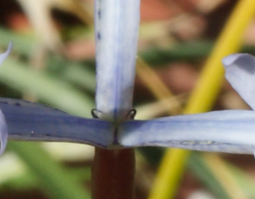 One shared characteristic of the tripetala "complex," as it's now called, is a small or completely missing inner tepal. The inner tepals are the three inner petals of the Moraea flower, corresponding to the standards in an Iris. The tiny fishhook-shaped appendages in the center of the photo below are the inner tepals of one of the tripetalas.