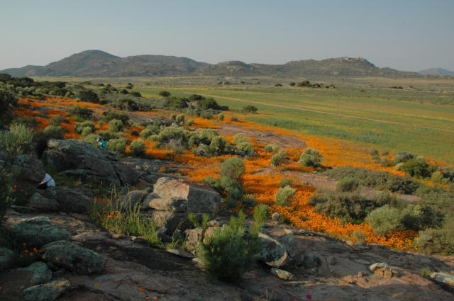 Namaqualand is an arid area in northwest South Africa. Although it is a winter rainfall area, rainfall is sparse and the plants found in this area are not included in some of the books illustrating South African bulbs since it is not considered part of the Cape Floral province. For most of the year, the land appears to be a desert and because it has an average annual rainfall of 50-400 mm it could be classified as such. But in a year with adequate rainfall, it becomes alive with an amazing floral display of annuals, bulbs, dwarf shrubs, and succulents. Flowering usually occurs in August and September, but dry winds that halt the display can end it sooner. In a year with little rainfall, there are few flowers. Summers are hot and dry but there is occasional fog since the ocean is not that far away. Photos from Bob Rutemoeller and Mary Sue Ittner.