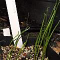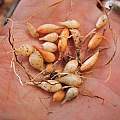 Typical seed pod and seed photos by David Pilling; the seed pod is about an inch long and has three sections. The fourth picture by Travis Owen shows seedlings that were sown at various depths in the Autumn of 2014 and left in a gravel plunge through the Winter. The seedlings slowly germinated in late Winter, but had to be protected from rain as the rain drops caused the earliest seeds to germinate to die. The last photo shows first year seedling bulbs of the same pot, repotted in late June of 2015.
