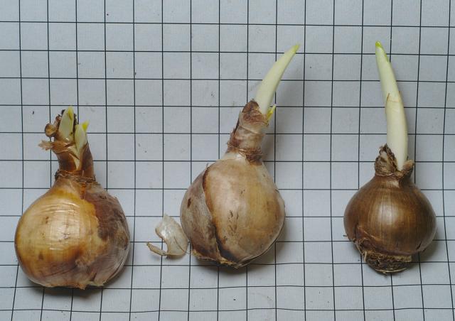 Narcissus 'Scarlet Gem' is a daffodil with numerous long lasting scented flowers per stem. When planted as dry bulbs in Fall it flowers in mid-season, but left in the ground in mild conditions it will produce leaves in Autumn and be one of the first daffodils to flower. About 14 inches high, it dates from the early 20th. century. Photos by David Pilling; the bulbs are shown on a 10 mm grid.