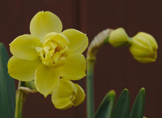 Narcissus 'Tahiti' a double daffodil, whose stems are robust enough to carry its flowers. RHS award of garden merit. About 14 inches tall. Photos David Pilling.