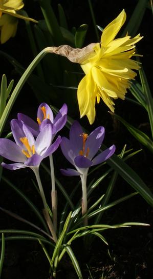 Narcissus 'Rip Van Winkle' is a diminutive double daffodil, just six inches high. Synonymous with Narcissus minor var. pumilus 'Plenus'. It originated in Ireland at the end of the 19th. Century. Despite its name it flowers relatively early. The heavy flowers have been known to flop over after rain, best grown in a sheltered spot. In the photos below by David Pilling it can be seen towering over Crocus tommasinianus.