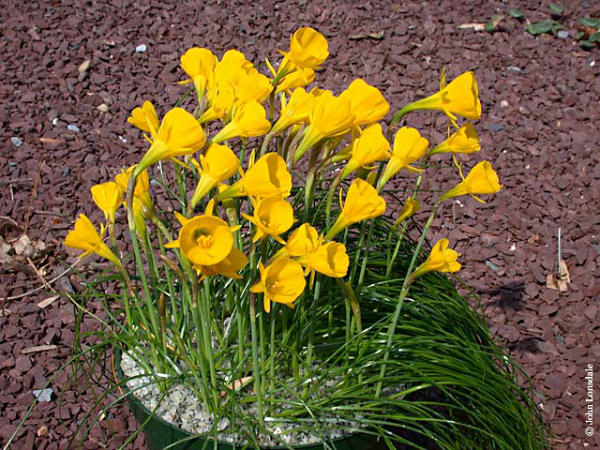 Narcissus obvallaris. 1b(B) - classic daffodils with large flowers. Small, solid yellow flowers. Native to Spain, but naturalized in the UK. This is an adaptable plant. PBS members report that they have been able to get it to naturalize and self-sow in Oregon and Kansas City, MO. Obvallaris means "surrounded as by a wall" referring to the corona. The common name is "The Tenby Daffodil". Photos by David Pilling.