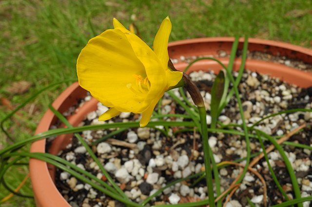 Narcissus minor. 1b(A) - classic daffodils with small flowers. Similar to N. asturiensis, but larger. Unknown origin, may be a hybrid. Louise Beebe Wilder wrote: "It is a pretty and gay thing, its twisted perianth, flanged trumpet, rich color, and nose-dive pose giving it a dashing appearance."