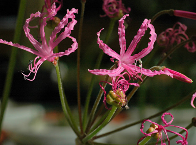 Nerine is a genus of 25 species in the family Amaryllidaceae 21 of which are endemic to the geographic areas of South Africa, Lesotho and Swaziland. The other 4 occur throughout southern Africa. Only 4 species are winter growing and 21 are summer growing, a subset of which are evergreen. Graham Duncan's Grow Nerines and The Amaryllidaceae of Southern Africa are good resources. In cultivation, Nerine has been widely hybridized. See Nerine Hybrids for photos of hybrids.