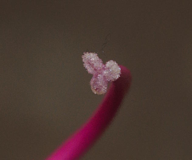 The first photograph below shows bulbs two years after the seed was sown (in June 2009). The bulbs have survived being a couple of degrees below freezing i.e. in pots on a shelf in the air, and flowered in August 2012; they have been evergreen. The second photograph shows flowering plants in a 4" high pot. The style continues to develop after the flower opens and it reaches the pollen receptive form in photo five after about a week; compare with the initial form in photo four. Photographs by David Pilling.