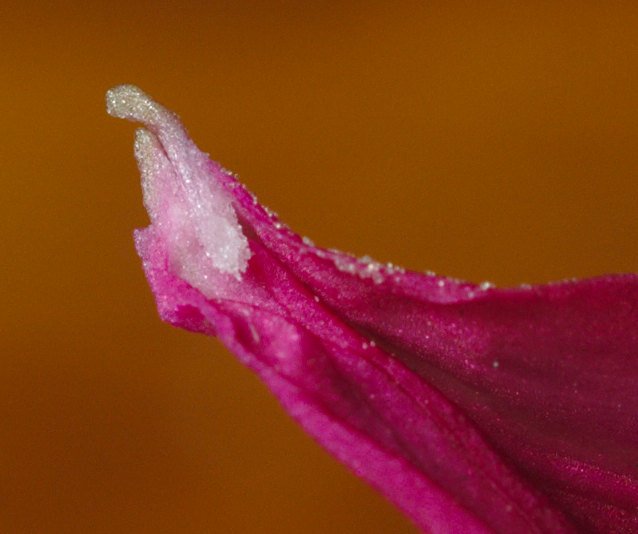 The tips of the petals have "cohering keels" which are structures that keep the flowers closed until fully developed. It is common to find petals locked together; the first photo shows two such petals; the second photo shows them separated. The final two photos are details of petal tips. For more information on this subject see the entry for Amaryllis belladonna.