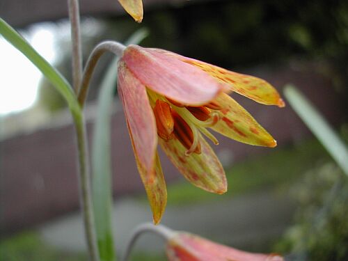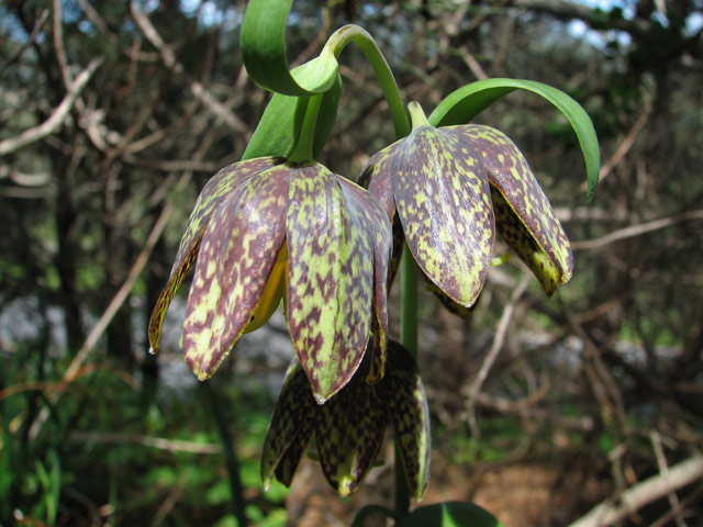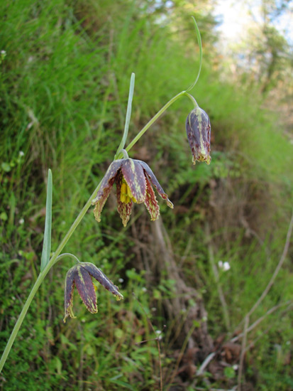 Fritillaria eastwoodiae Macfarlane is native to Northern California, where it is found growing in deciduous and coniferous forests in heavy soils, sometimes serpentine. Height: 20-80 cm. The pictures taken below show one grown and photographed by Dirk Wallace.