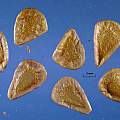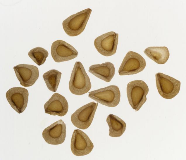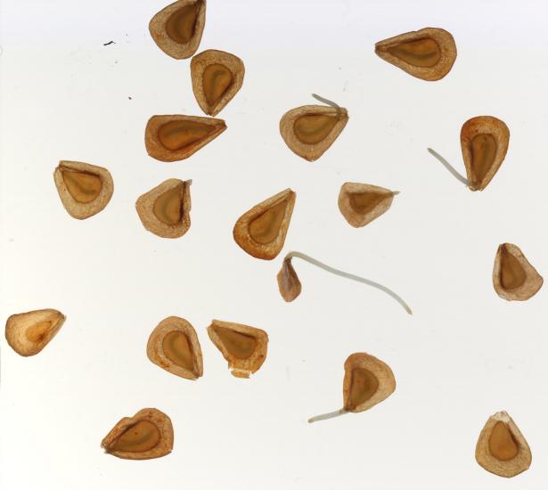 Seed photos by David Pilling, the second of the same seed was taken using transmitted light, embryos are barely visible, see Fritillaria Germination. The next photo was taken 57 days later after the seeds had been exposed to cold (32-40 °F) and wet and shows the embryos have developed and germination has begun.