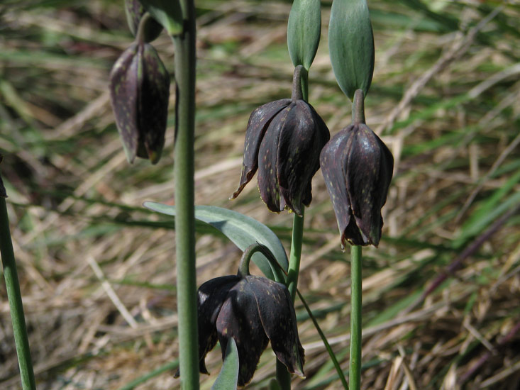 Fritillaria atropurpurea Nuttall is found in the west of the USA and is commonly known as the 'spotted fritillary'. The name means 'dark purple' in reference to the color of the spots. Plants grow in sheltered edges of forests, near shrubs at mid to high elevations in Oregon and Northern California. We found them hard to see at first. Height range: 15-60 cm. Photos were taken at Lakes Basin Recreation Area, Plumas County, California by Mary Sue Ittner.