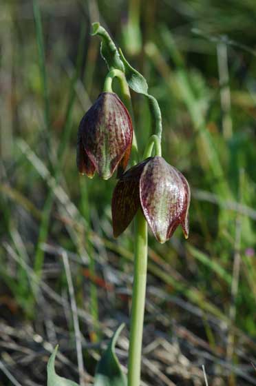 Fritillaria biflora Lindley is native to the coastal ranges of California where it grows in sunny grassy areas with heavy soils. It has chocolate brown flowers. In spite of its name, it can have 1 to 5 flowers although the first picture shows a bulb flowering in February 2004 in Northern California with the expected two flowers. The next two pictures were taken April 2005 at Figueroa Mountain (Santa Barbara County, California). Height: 15-45 cm. The first three photos by Mary Sue Ittner. The fourth was taken by Jim Duggan in San Diego County. The last is a photograph of a bulb grown in zone 7 Montgomery County, Maryland by Jim McKenney and photographed on June 19, 2008 against a quarter inch grid.