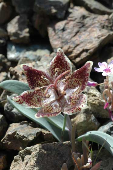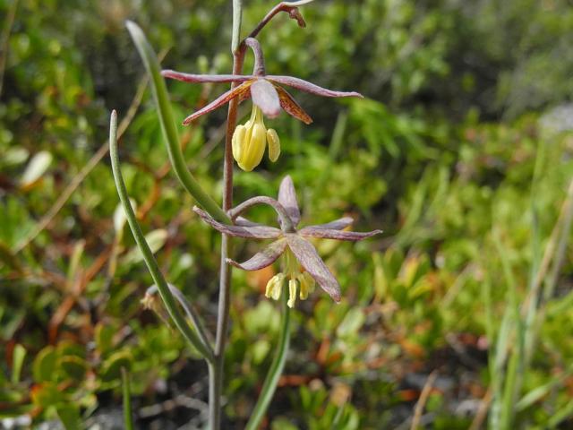 Fritillaria glauca Greene, known as the Siskiyou fritillary, grows on high elevation serpentine slopes from 900 to 2000 m (300 to 6700 ft) in full sun in southwest Oregon and northwest California. It is a short species (10 cm) with nodding flowers that are yellow to mixed yellow and brown to deep brown with red or brown markings. Photo from Elaine Allison.