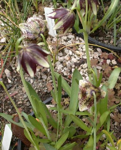 Fritillaria biflora × Fritillaria purdyi hybrids. The illustrated plants are probably bee-made hybrids between F. biflora and F. purdyi, occurring among seedlings raised from garden-collected seeds of these two species. Possible F. purdyi × F. biflora (F. purdyi being the seed parent) is a very robust plant, flowering earlier than pure purdyi, with 10 flowers showing typical F. purdyi form and markings but with a green rather than white ground color. Possible F. biflora × F.purdyi, two of five flowering seedlings, are smaller at first flowering but otherwise similar to the first hybrid. All the hybrids have more glaucous leaves than F. biflora, a F. purdyi characteristic. Photos by Jane McGary.