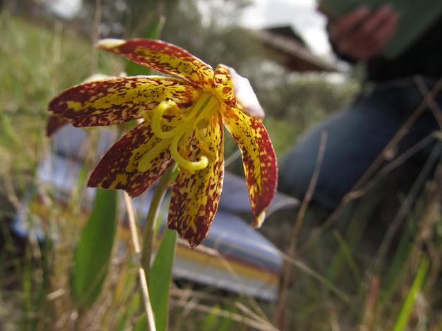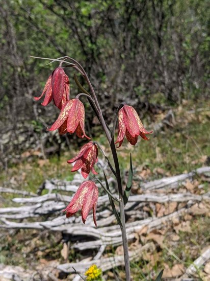 Fritillaria gentneri Gilkey is an endangered species of only a few small populations in Southern Oregon and in Siskiyou County, California. Height: about 30 cm. There is some debate as to whether it is a true species, or a fertile hybrid between Fritillaria affinis and Fritillaria recurva. Both F. affinis and F. recurva have been found in close proximity to populations of F. gentneri, so many botanists doubt it is a true species but instead a fertile hybrid showing intermediate characteristics of both parents. Read more about the debated species in a publication by the Native Plant Society of Oregon (NPSO) here and in the Recovery Plan proposed by the US Fish and Wildlife Service here. Photos from iNaturalist taken by lcwimmer1 in Jackson County, Oregon in April and shared in under a CC BY-NC license.