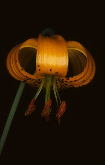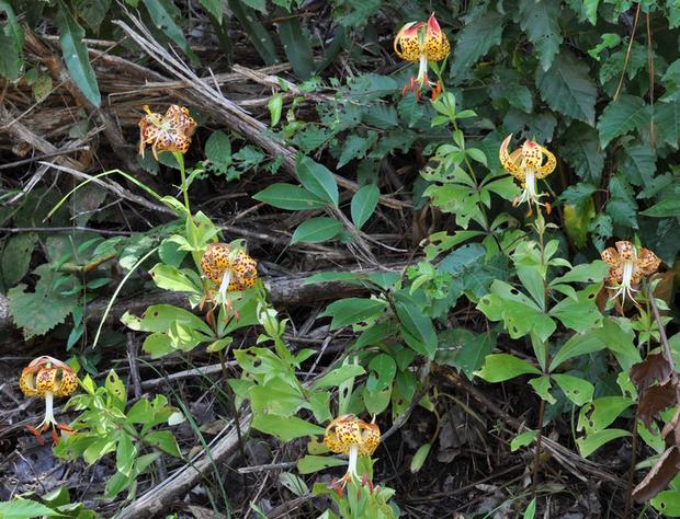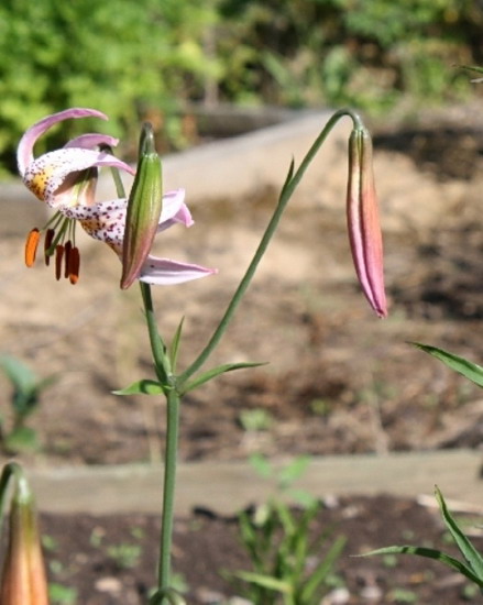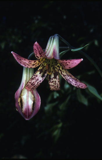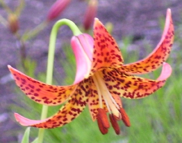 Lilium grayi S.Watson is found at scattered sites in the mountains of western Virginia, North Carolina and Tennessee. Rarely seen in gardens in the eastern states and seems to grow more freely in cooler northern areas. Height range: 2-4 ft. Photo 1 by Wayne Crist of a plant grown by Jim McKenney in his bog trays, with Sarracenia in the background. Photo 2 of a bulb by Pontus Wallstén.