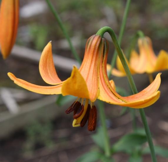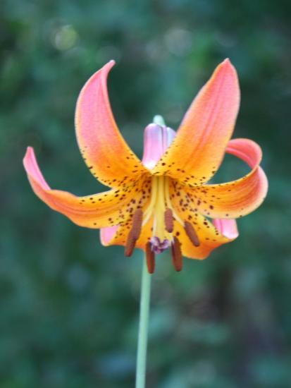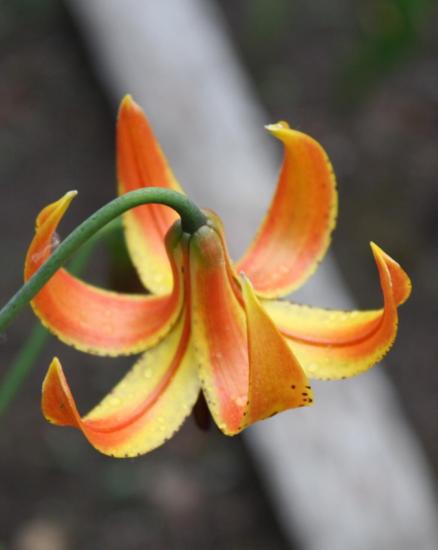 Lilium columbianum Leichtlin grows from Northern California north to Canada. Flowers are golden yellow to bright orange with dark purple spots or blotches and up to 30 flowers per stem. Height: to about 4 ft. In photo 1 by Ron Moodycliffe the flowers are golden yellow. Photos 2-4 are from Richard Haard. The last shows germinating seeds: 30 days warm strat (50 °F) then 2 weeks cool (40 °F). Photo 5 of a bulb by Pontus Wallstén.