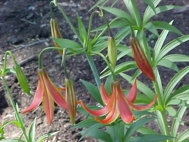 Lilium catesbaei Walter from southeastern North America, requires conditions which would kill most lilies: wet, hot, acidic soil. It generally blooms late in the year and typically there is only one flower. Height range: 2-3 ft. Grown by bog plant guru John Hummer and photographed by Jim McKenney. Two forms are shown here. Anecdotal evidence suggests that the plant with spidery flowers originated in northern Florida. The one with broader tepals purportedly came from coastal North Carolina.