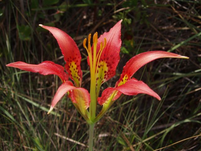 Lilium michauxii Poir. is native to Virginia, the Carolinas, Georgia, Alabama, Louisiana and Florida in the United States. It likes dry, well-drained soils. It is commonly called the 'Carolina lily'. Height range: 1-4 ft. Photos 1 and 2 were taken in Tyler County, Texas by Justin Smith. Photo 3 of rhizomateous roots by Pontus Wallstén.