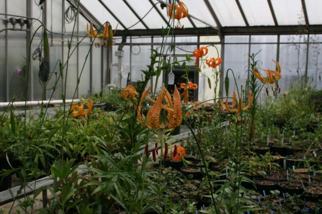 Lilium iridollae M.G.Henry is native to the Florida panhandle and a few adjacent Alabama counties. In the wild it grows in two distinct habitats: seepage bogs in otherwise dry, upland pine (Pinus palustris) forest and wet, organic soils of the riparian zone of the unique "blackwater" rivers characteristic of this region. Both habitats are extremely wet, but in the latter habitat Lilium iridollae may occur in estuary areas and may become inundated with brackish water during tidal fluctuations. Lilium iridollae has been regarded as difficult, if not impossible, to grow in cultivation but seed germination and cultivation experiments indicate that it is easy to grow in bog gardens and containers with a medium that suits Sarracenia, Drosera, and other carnivorous plants that are common companions of Lilium iridollae in the wild. Height range: to about 6 ft. Pictures shown here, taken by Peter Zale, are of plants in the wild (first row) and in cultivation in a greenhouse in central Ohio, USA. So far, initial reports indicate that Lilium iridollae is cold hardy to USDA zone 5 when proper soil and moisture conditions are provided.