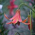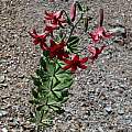 Lilium maritimum Kellogg is a rare lily with red tubular flowers and is found in California in the southern part of the North Coast ranges where it is found in scrub, fens, or gaps in the closed-cone forests, usually in low places where it stays wet longer. Germination is cool hypogeal; small bulbs are formed in winter and leaves appear in spring. Height: to about 2 ft. The first two pictures were taken by Bob Rutemoeller near Gualala, California. The next two by Mary Sue Ittner were taken of plants in the road verges in Mendocino County.