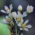 Nothoscordum gracile (Aiton) Stearn, syns. Nothoscordum fragrans (Vent.) Kunth, Allium gracile Aiton, and Allium fragrans Vent. from South America has grass-like leaves. It is closely related to Allium species, but lacks the onion or garlic odor when crushed. Height: to .5 meter. It is extremely prolific, invasive, and difficult to eradicate and often seen in botanical gardens for this reason. It is native to Argentina, Bolivia, Brazil, Chile, Colombia, Costa Rica, Ecuador, Guatemala, Honduras, Mexico, Panamá, Paraguay, Peru, and Uruguay, but is found in Algeria, Australia, Azores, Baleares, Bermuda, Canary Is., Cyprus, East Aegean Is., Egypt, France, Great Britain, Greece, Jamaica, Jawa, Kenya, Libya, Madeira, Malawi, Mauritius, Morocco, New Zealand, Norfolk Is., Palestine, Portugal, Réunion, Sicilia, South Africa, Spain, St.Helena, Tanzania, United States (Alabama, California, Florida, Georgia, Louisiana, Mississippi, South Carolina), and Zimbabwe