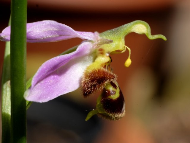 Ophrys apifera Huds., the bee orchid, is a middle-sized hardy species native to the Mediterranean, but also occurring in Ireland, the southern UK, and Germany. It grows in calcareous dry grassland or open forest areas. Unusual in Ophrys, the pink flowers tend to practice self-pollination in the more northern parts of their range, which results in a high rate of producing seed, but also to a reduced longevity of the plants since the high cost of seed production weakens the plants.