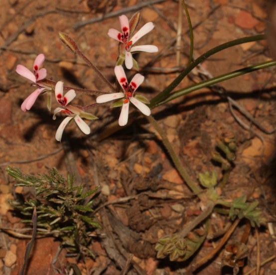 Pelargonium parvipetalum E.M. Marais is a tuberous South African plant from the Pakhuis Pass in the South to Gamoep in the North, in various habitats and soil types. The flowers are white with the upper two having dark red feathering. It's one of the earliest flowering plants of this Section, its peak flowering being in September. The petals are very small and insignificant, thus its name. (Section Hoarea, Auritum Group). Photos David Victor.