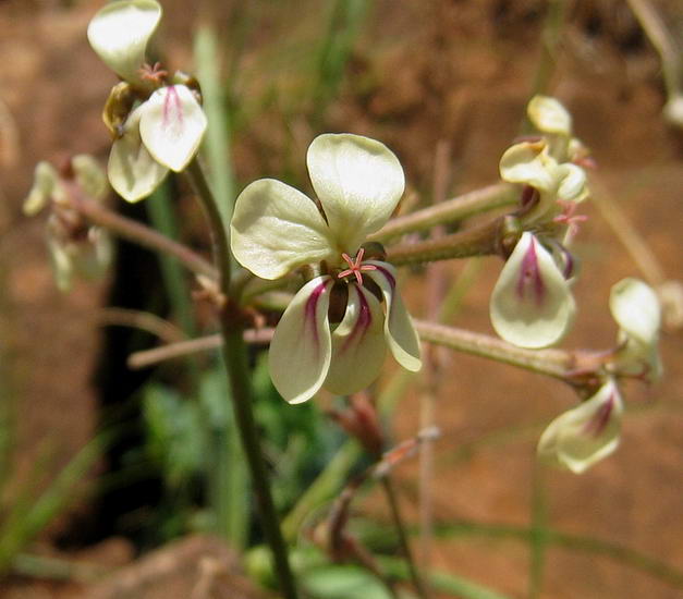 Pelargonium proliferum (Burm.f.) Steud. is a tuberous plant from the Southwest Cape area of South Africa, from Nieuwoudtville to Bredasdorp. It grows in fynbos on sandstone and in renosterveld on shale. The flowers may be white, cream, pink, with wine red feathering on the top two. Flowering takes place between October and December. The name refers to the fact that the branching scape produces several peduncles, each with many-flowered pseudo-umbellets. (Section Hoarea, Proliferum Group). Photos David Victor.