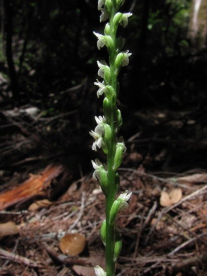 Piperia candida Rand.Morgan & Ackerman, syn. Platanthera ephemerantha R.M.Bateman, is known as the white flower rein orchid. It is native to western North America from Alaska to the San Francisco Bay Area, where it grows in coniferous forests and other habitat in coastal and inland mountain ranges within 100 miles of the coast. The flowers are sweetly fragrant, and are whiter than those of other Piperia, but sometimes contain some green veining or margins. Height range: 30-45 cm. Photos from Aaron Arthur.