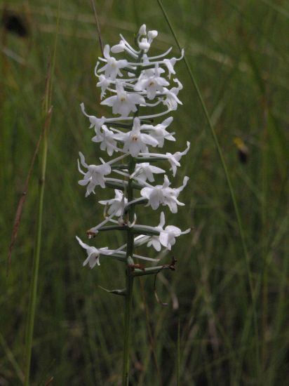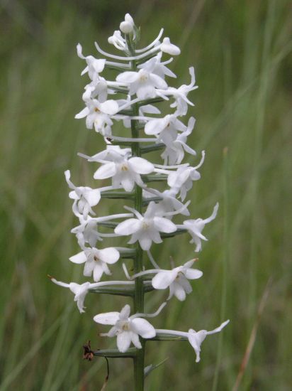 Platanthera nivea (Nutt.) Luer is a widespread species occurring primarily on the coastal plain throughout the eastern United States in pine flatwoods, seepage areas, and wet prairies. It is generally scarce, though locally abundant where it occurs. Recently it has been proposed that this species be moved to the genus Gymnadeniopsis along with several other members of the genus Platanthera. An interesting anecdote which I have heard repeated by many who have seen this flower, is this is one of the whitest whites among flowers, nearly glowing it is such a "bright" shade. Height range: 1-3 ft. Photos by Alani Davis.