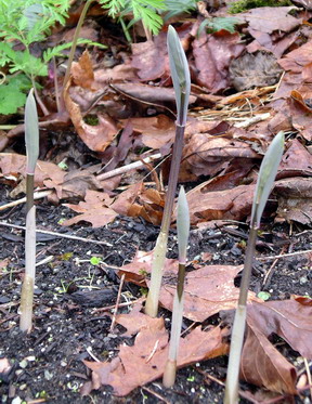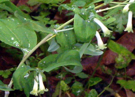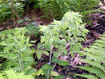 Polygonatum zanlanscianense Pamp. is native to China. The plant pictured below was purchased as Polygonatum cirrhifolium, but the owner was sure it was incorrectly identified since her plant had black berries instead of red. It was 1.5 m high with clasping tips to whorled leaves. It has been identified as Polygonatum zanlanscianense. Photo by Anne Wright.