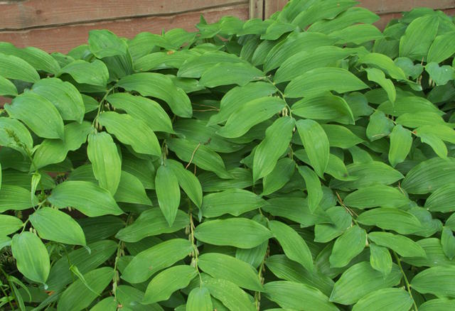 Polygonatum odoratum (Mill.) Druce is native to Europe and Asia. The white flowers occur in pairs and hang beneath the leaves. Height range: 45-60 cm.