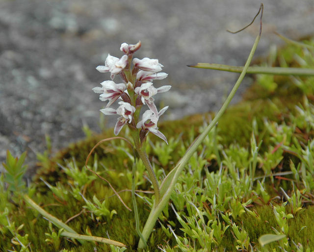 Prasophyllum cucullatum Rchb.f. syn. Chiloterus cucullatus (Rchb.f.) D.L.Jones & M.A.Clem. or the Hooded Leek Orchid is found on rocky or sandy soils in southwestern Western Australia. This species is smaller than Prasophyllum gibbosum with a spike of small white and brown sweetly scented flowers 0.05–0.2 m high. The lateral sepals form a hood in front of the lip. Photos taken September 2007 adjacent to a rock outcrop in southwestern Western Australia by Bob Rutemoeller and Mary Sue Ittner. We think this is this species.