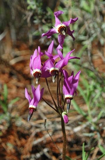 In 2007 in a paper entitled Transfer of Dodecatheon to Primula (Primulaceae) by Austin Mast and James Reveal, Dodecatheon was moved to Primula on the basis of DNA testing. It became Primula section Dodecatheon (L.) A. R. Mast & Reveal as a member of Primula subgenera Auriculastrum. These species look very different from most Primula species are believed to have evolved from a primula ancestor through the actions of buzz pollination by bees. Since this change seems to be adopted we are now including geophytic species that were formerly on our Dodecatheon page here. The species in section Dodecatheon, widely known as "Shooting Stars" or "Mosquito Bills", look a bit like miniature Cyclamen, but with projecting anthers that give the flowers a pointed look. They are widespread in North America, extending from northwestern Mexico to northwestern Canada, Alaska and also part of northeastern Siberia. In California there are two basic categories: high-elevation species that bloom in the late spring or summer and occur in moist habitats, and lowland species that bloom in late winter or spring and grow in the winter-wet, summer-dry Mediterranean climate regions of the state. Species have basal clumps of leaves and nodding flowers produced at the top of tall stems. In this wiki we include species that go completely dormant for part of the year and can be grown like bulbs. Rhizomes or caudices are usually present with fibrous roots and sometimes bulblets. The caudex is generally short-lived in most species and may or may not be obvious when the plants are dormant. Species are buzz pollinated by large bees. For more information on this former genus see Revision of Dodecatheon by James L. Reveal.