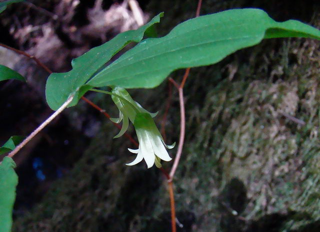 Prosartes maculata (Buckley) A. Gray, synonym Disporum maculatum (Buckley) Britton, the nodding or yellow mandarin is distributed in Ontario and from New York south to Georgia and Arkansas. The bell-shaped nodding flowers are cream-colored with purple spots and hang singly or in pairs from the ends of usually forked stems. Growing up to 80 cm, it has pale straw-colored berries. Photographs by Robert Pavlis.